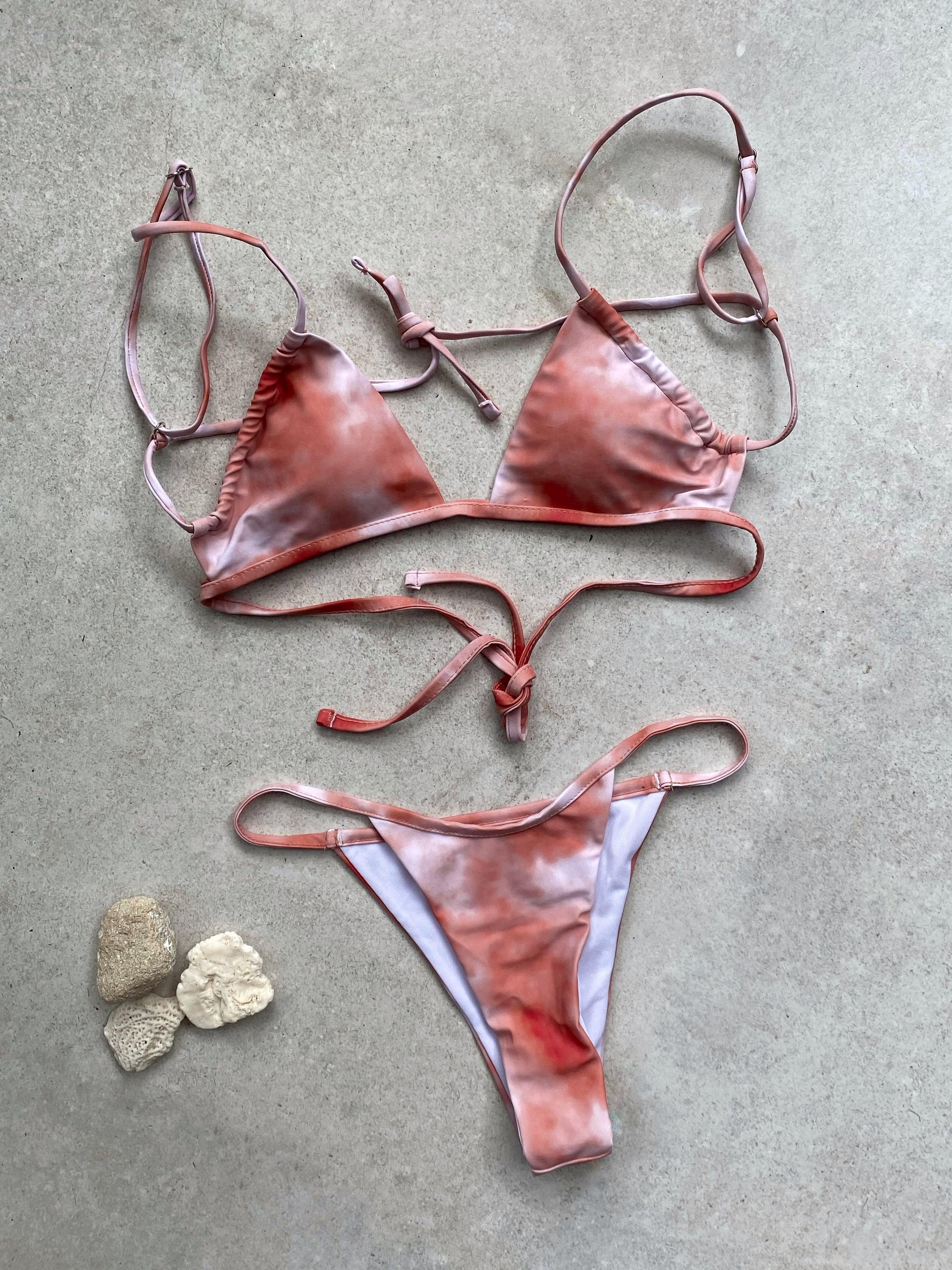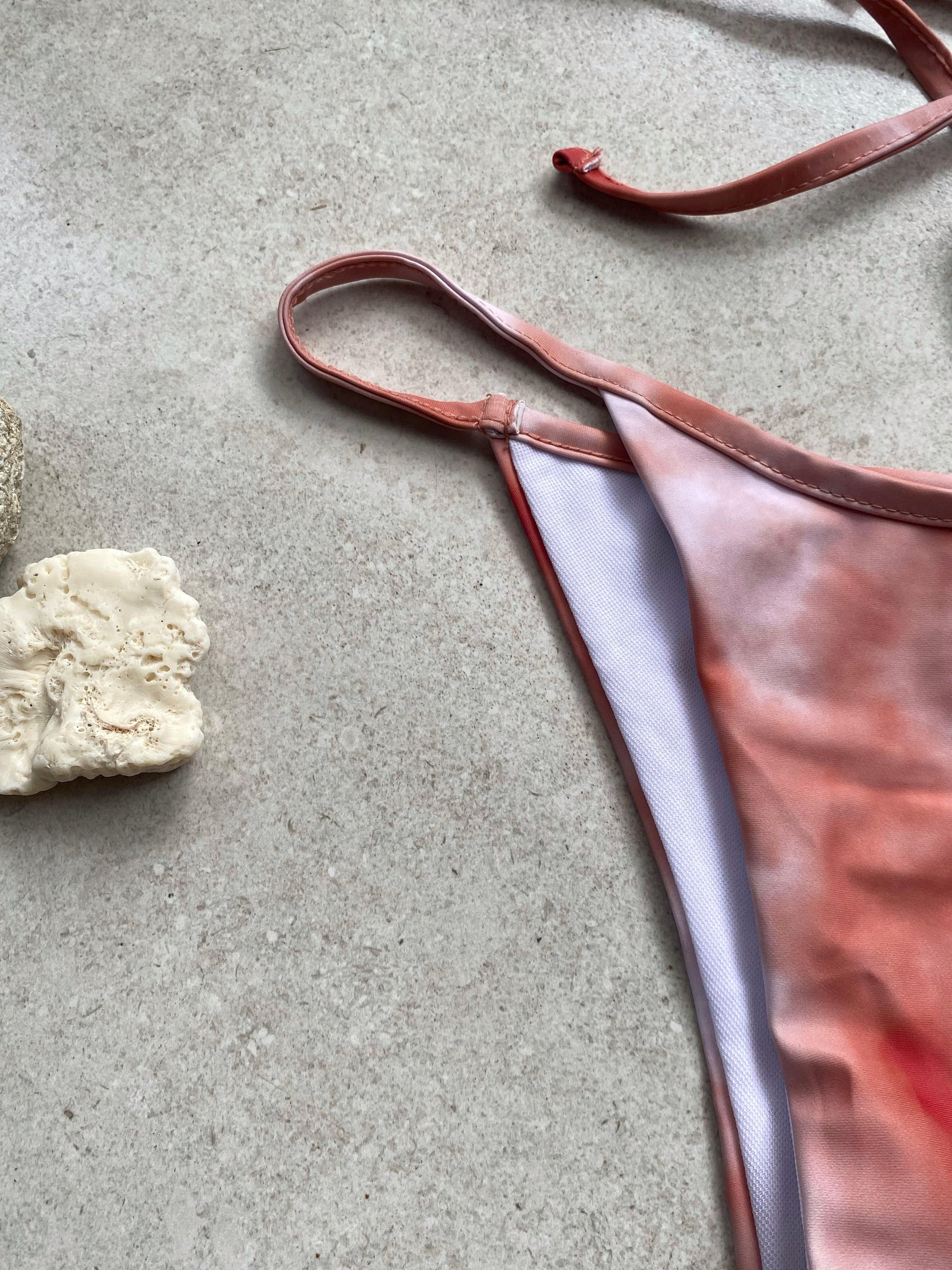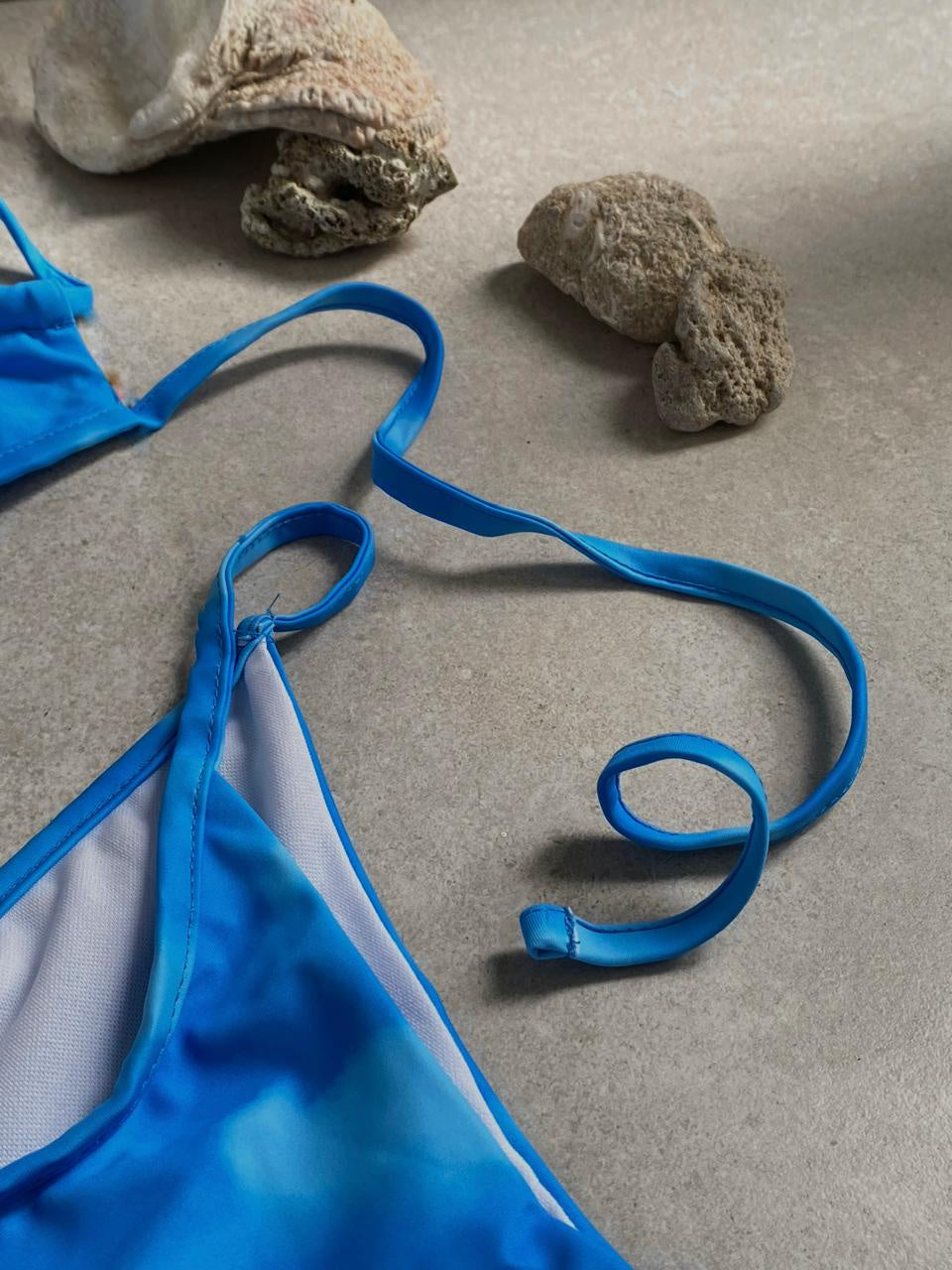 El top es tipo triángulo con tirantes ajustables que se anudan al cuello y la espalda, ofreciendo un calce versátil. La parte inferior es estilo corte alto con laterales delgados, acentuando la figura de forma elegante.