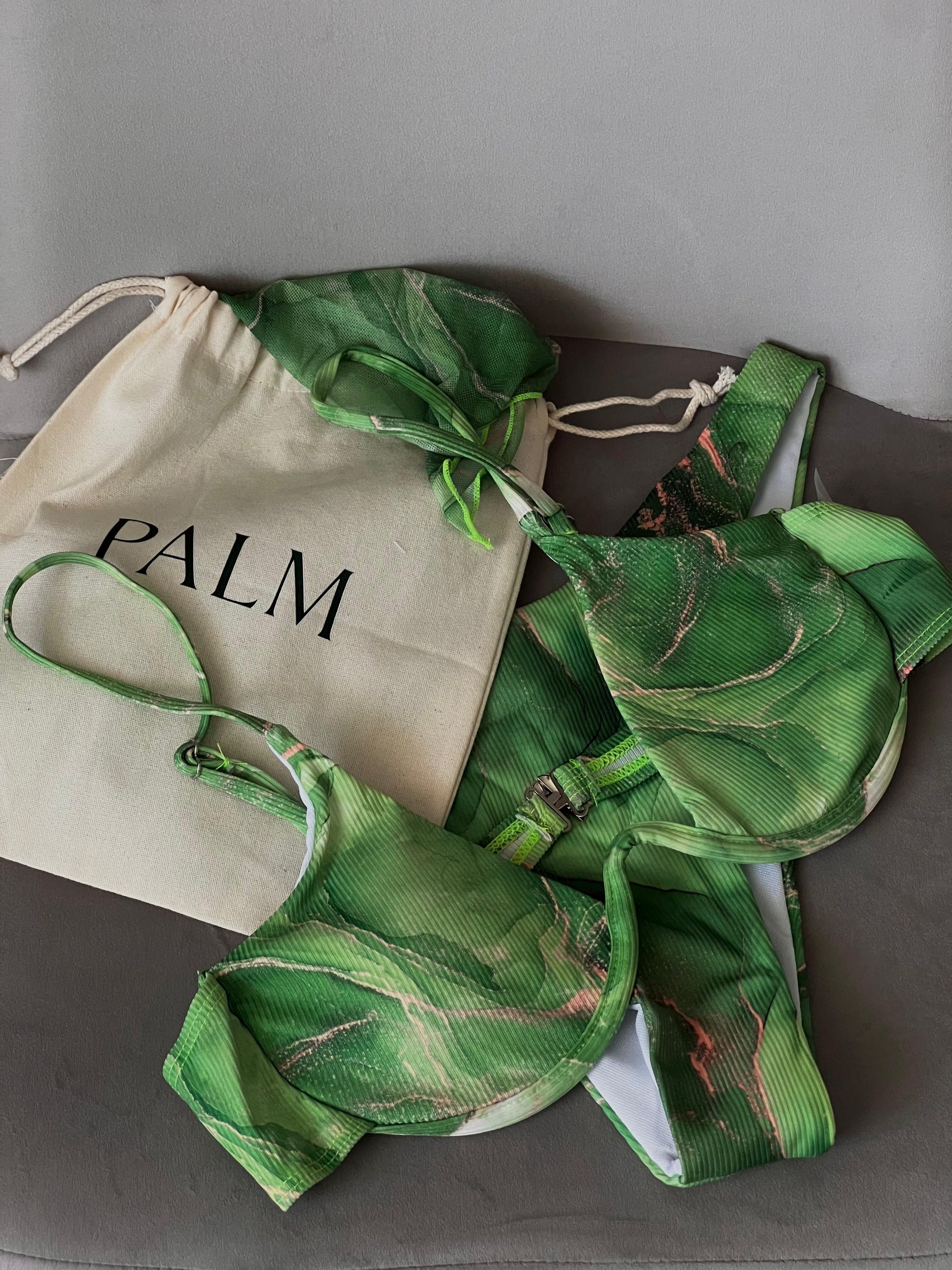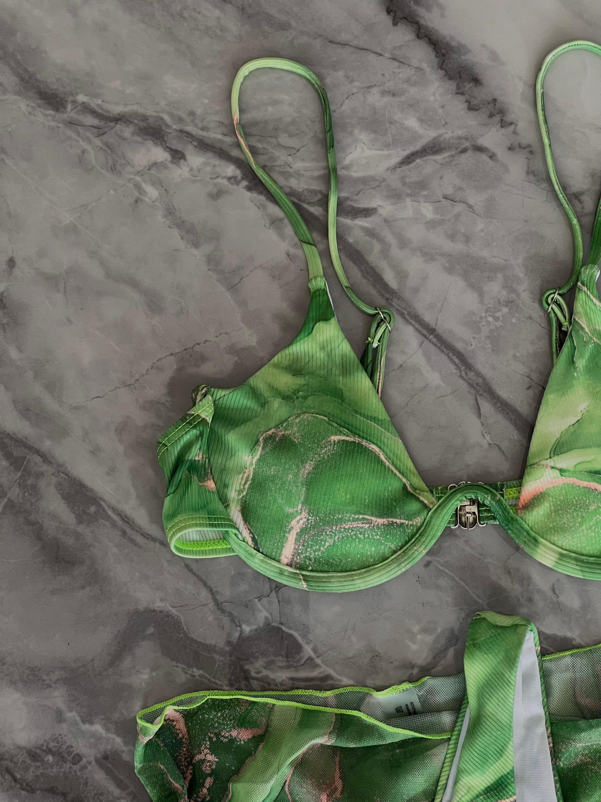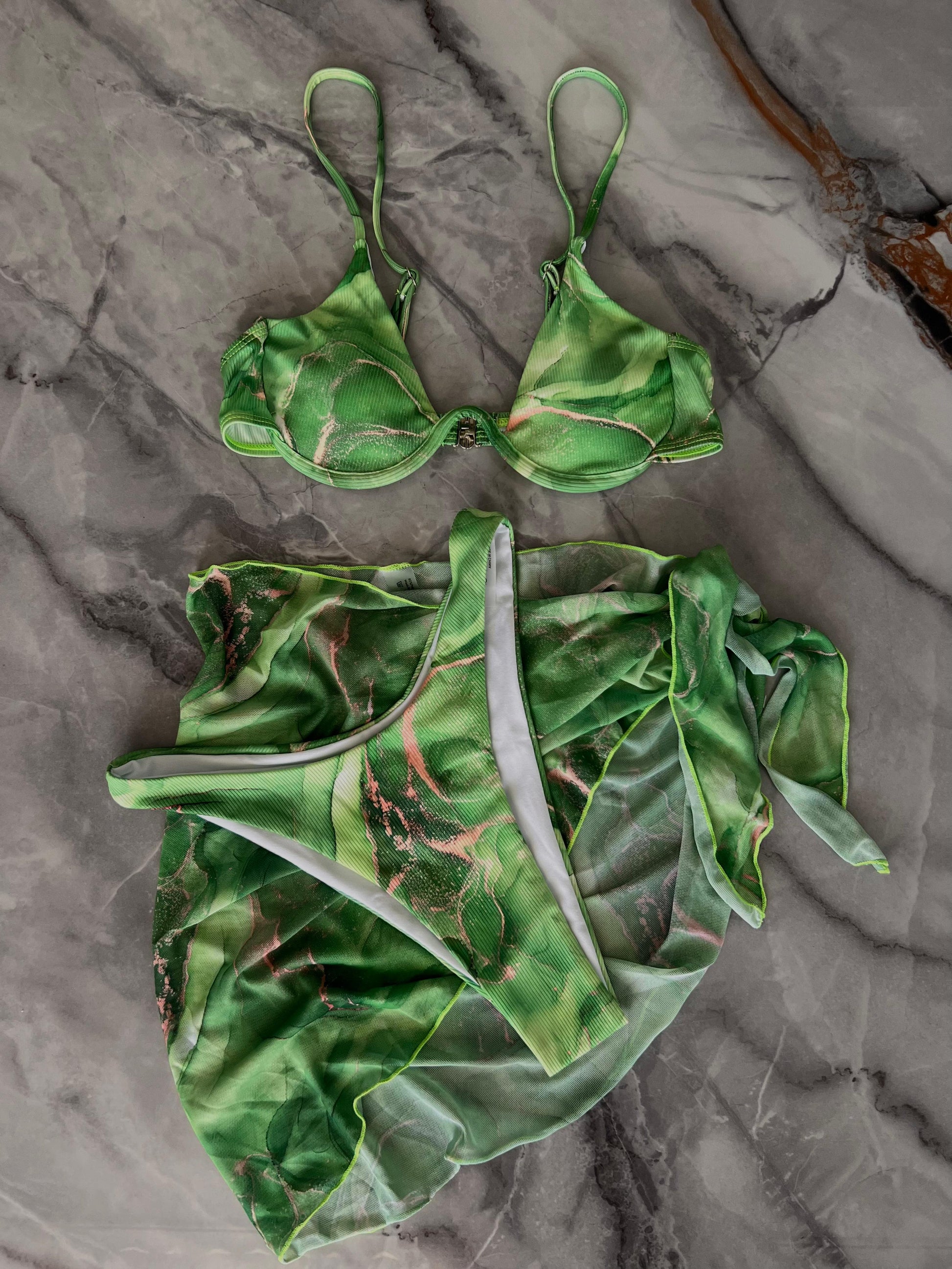 Conjunto verde con detalles marmoleados y pareo a juego.