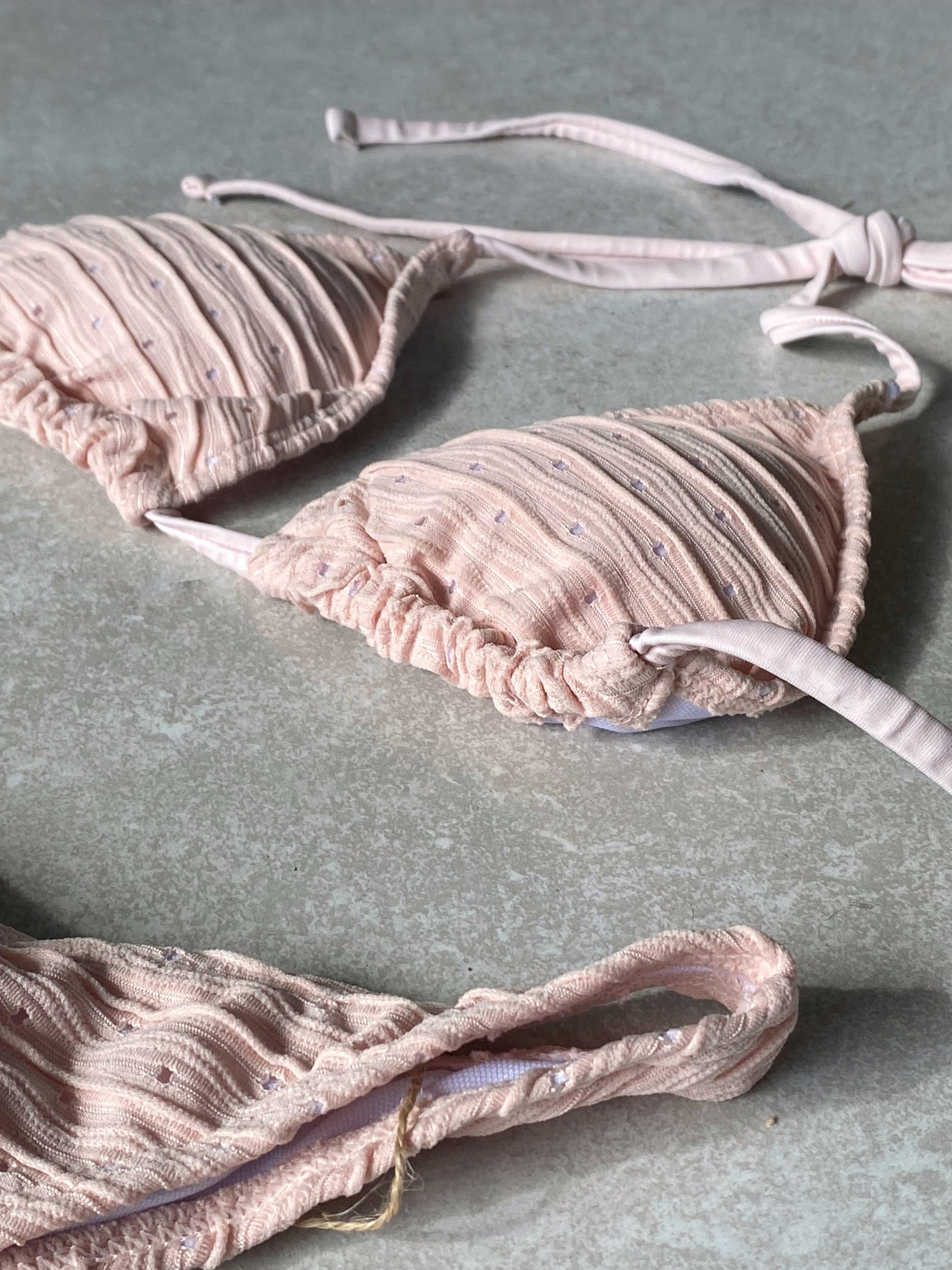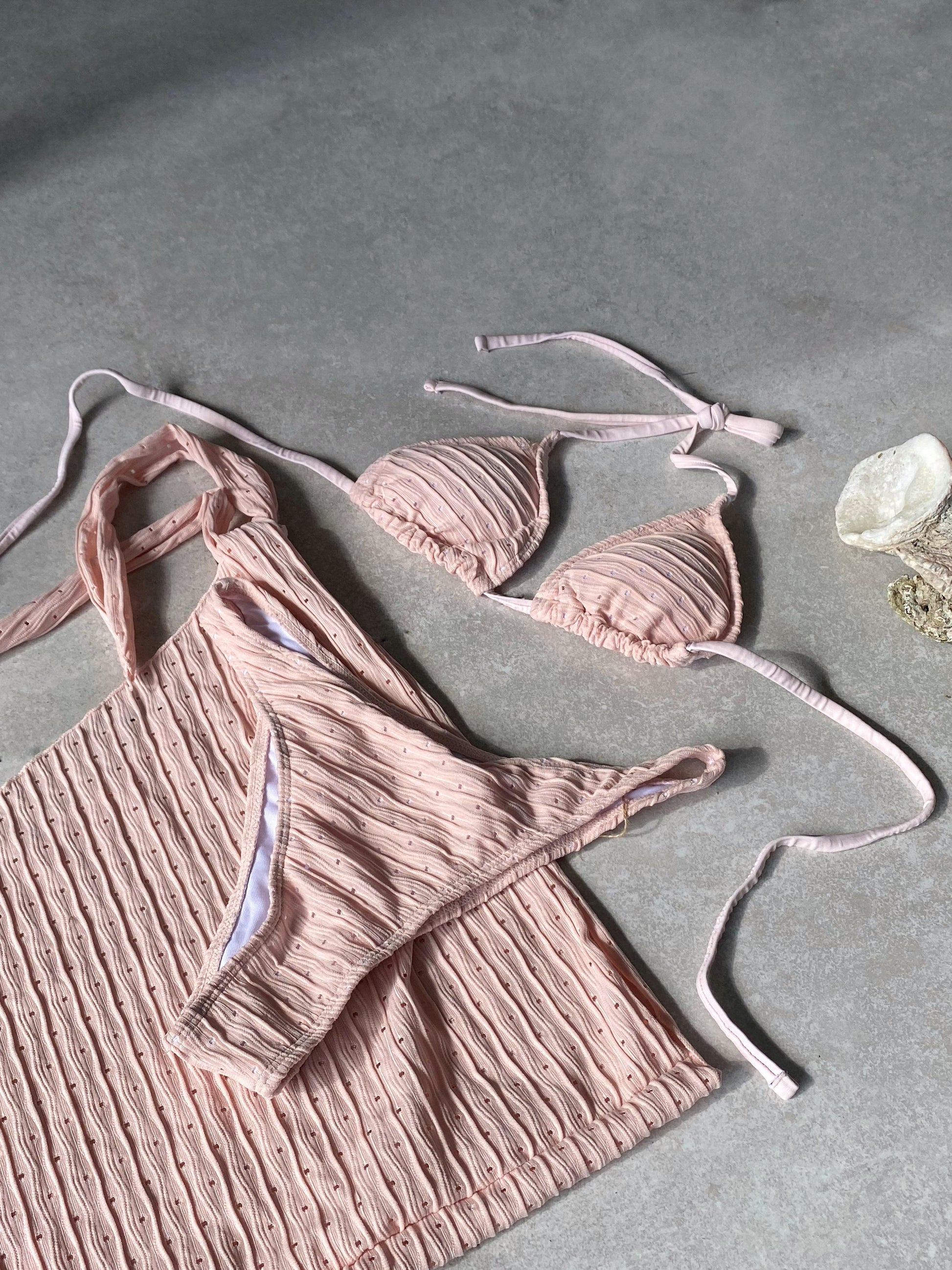 Delicado bikini rosa claro con textura acanalada y top triangular clásico. Incluye mini falda a juego para un look playero completo y femenino.