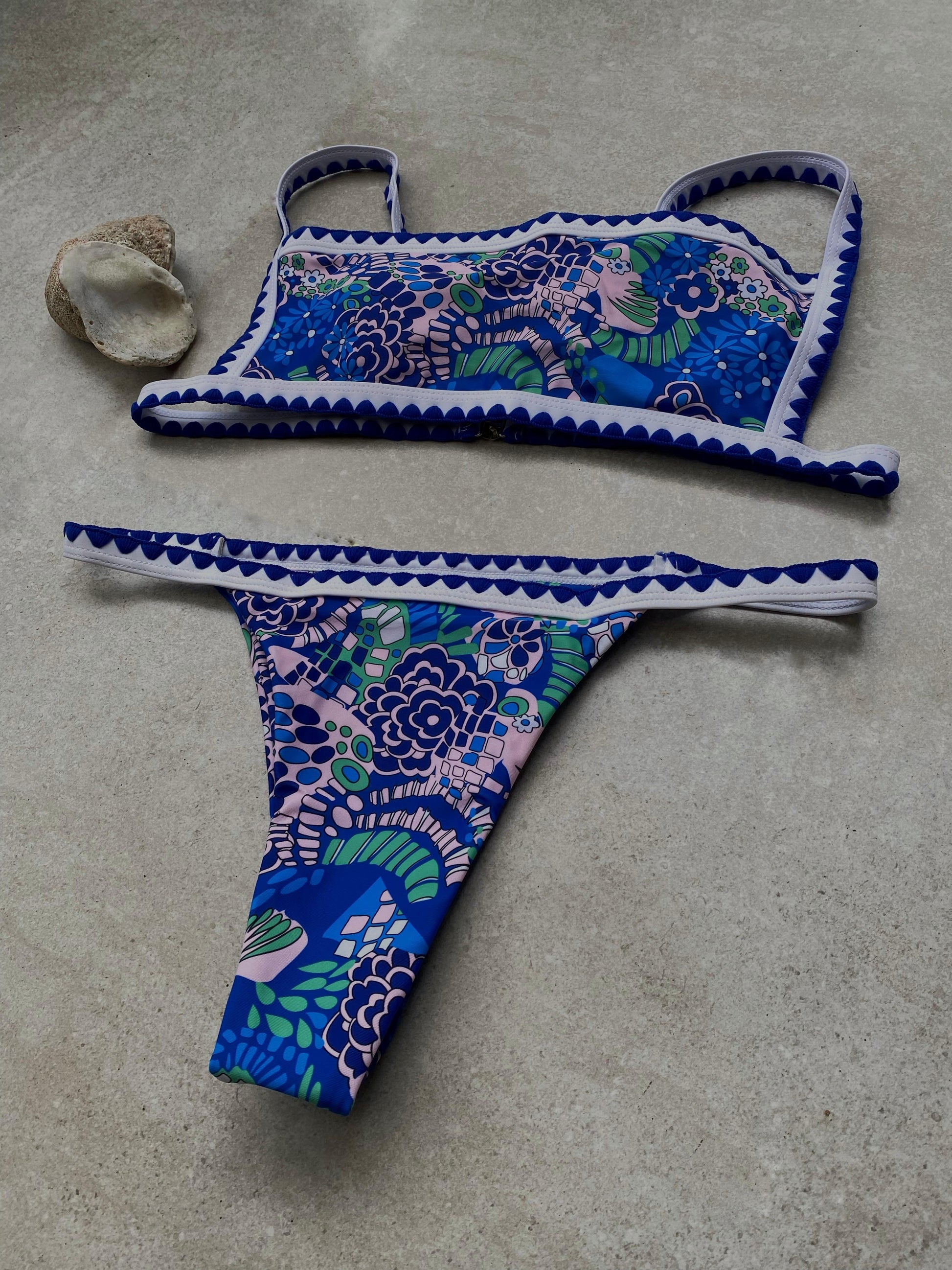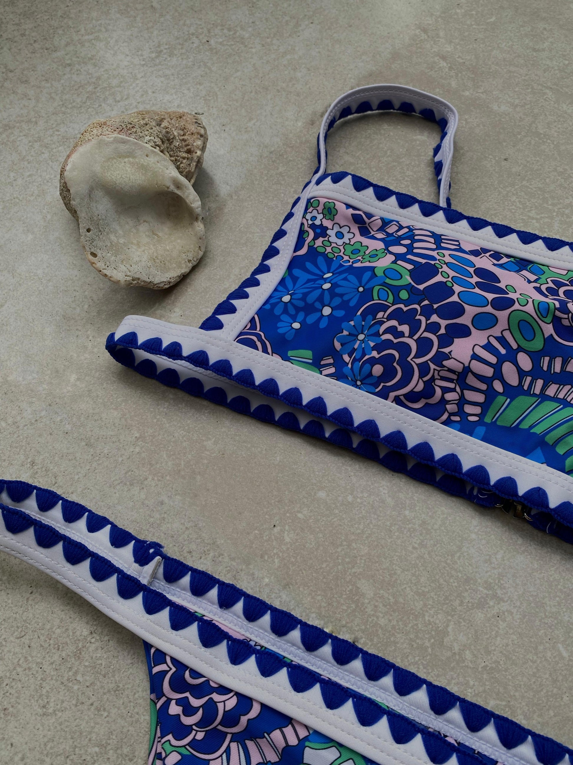 Bikini estilo retro con estampado floral en tonos azul, verde y lavanda. El top es tipo bandeau con tirantes finos y ribete blanco con detalle en ondas azul marino, aportando un toque artesanal. La parte inferior es de corte brasileño.