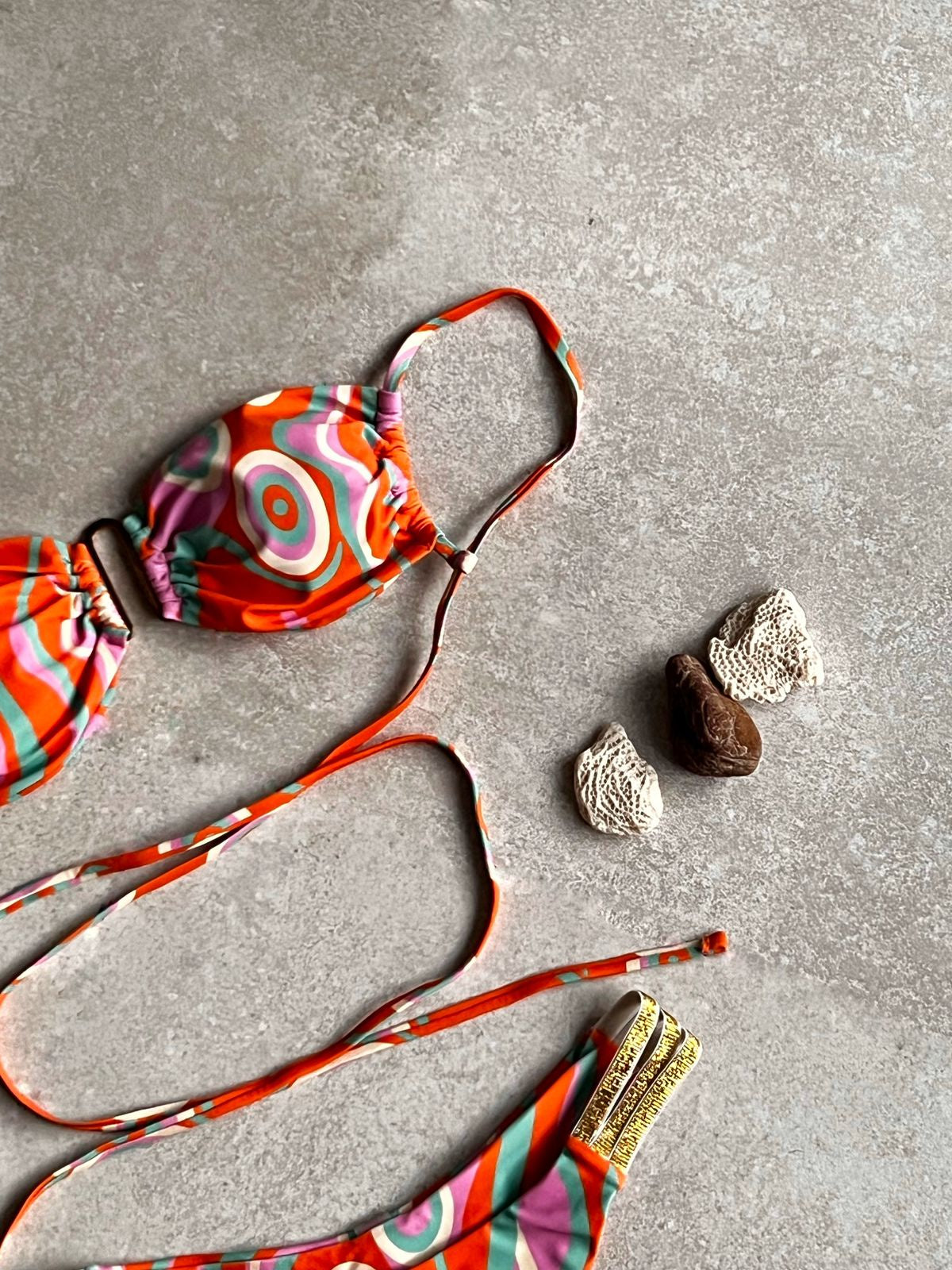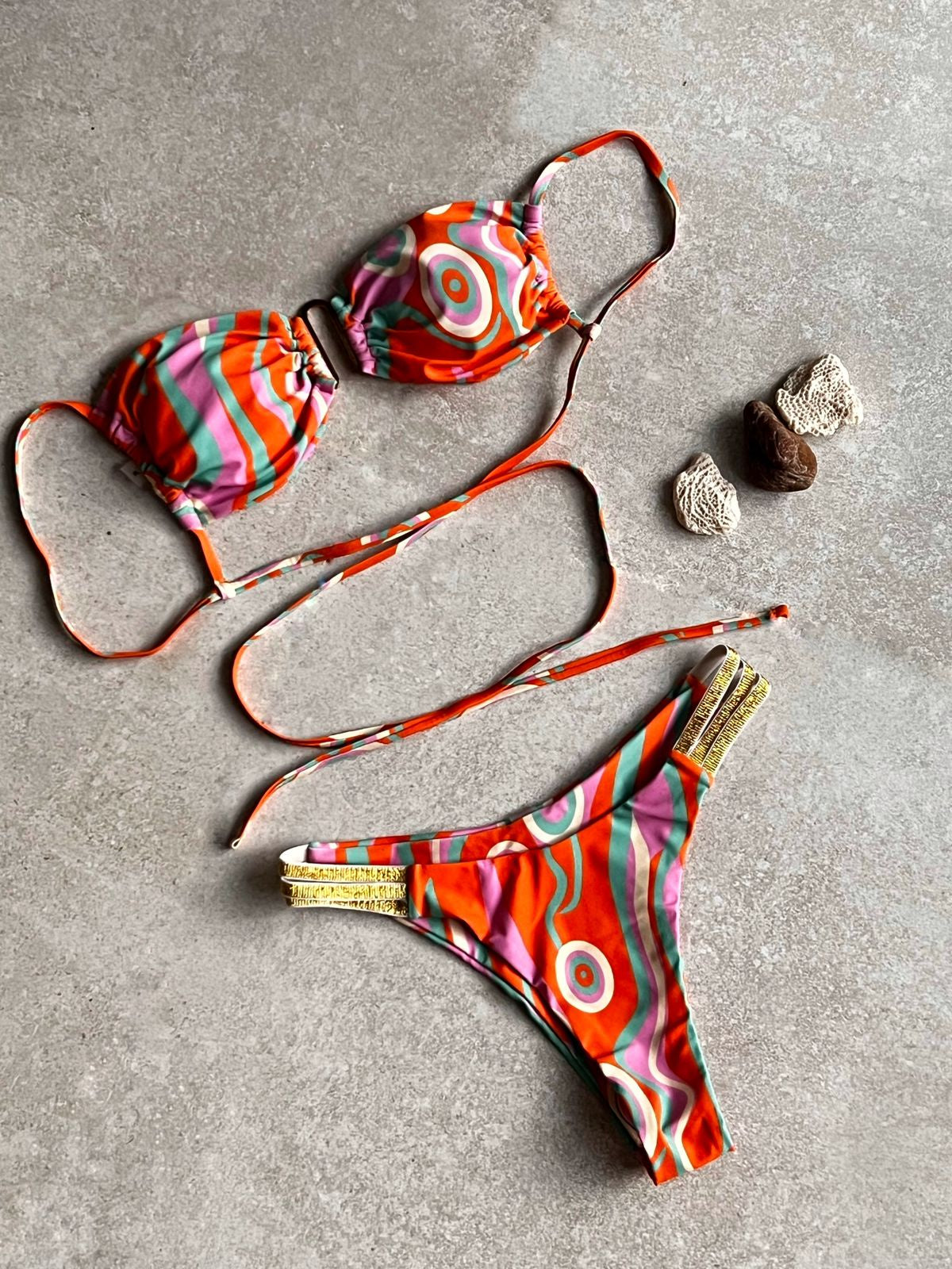 Bikini anaranjado, celeste y morado, para destacar sin miedo.
