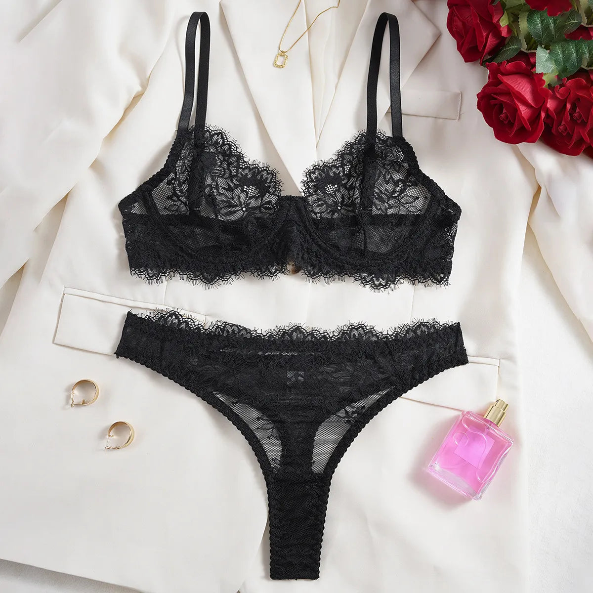 Delicado conjunto en encaje rosa pastel con bordado floral.